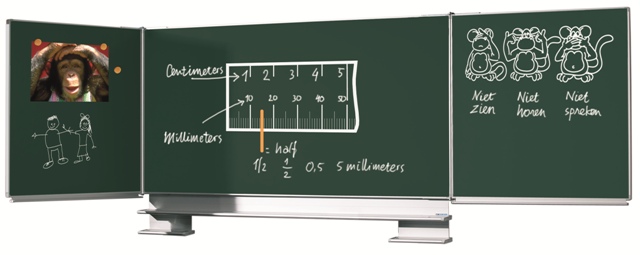 Ouderwets schoolbord in hoogte verstelbaar, groen krijtbord 120x200 cmAuthentiek groen schoolbord met scharnieren en 5 schrijfvlakken uitgevoerd als groen krijtbord, in de afmeting 120x200 cm, met de zijflappen uitgeklapt 120x400 cm. Dit krijt schoolbord is gemaakt van zeer duurzaam geėmailleerd staal en afgewerkt met fraaie aluminium profiellijsten. Het bordoppervlak is beschrijfbaar met echte bordkrijtjes en u kunt dit schoonvegen met een krijtbord wisser of vochtige spons. Het