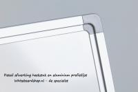 Dit whiteboard is voorzien van een stijlvolle en stevige profiellijst met fraaie grijze afgeronde hoeken. Bij de afbeeldingen vindt u een goede detailfoto's welke u een duidelijk beeld geven. Bijgeleverde accessoires: